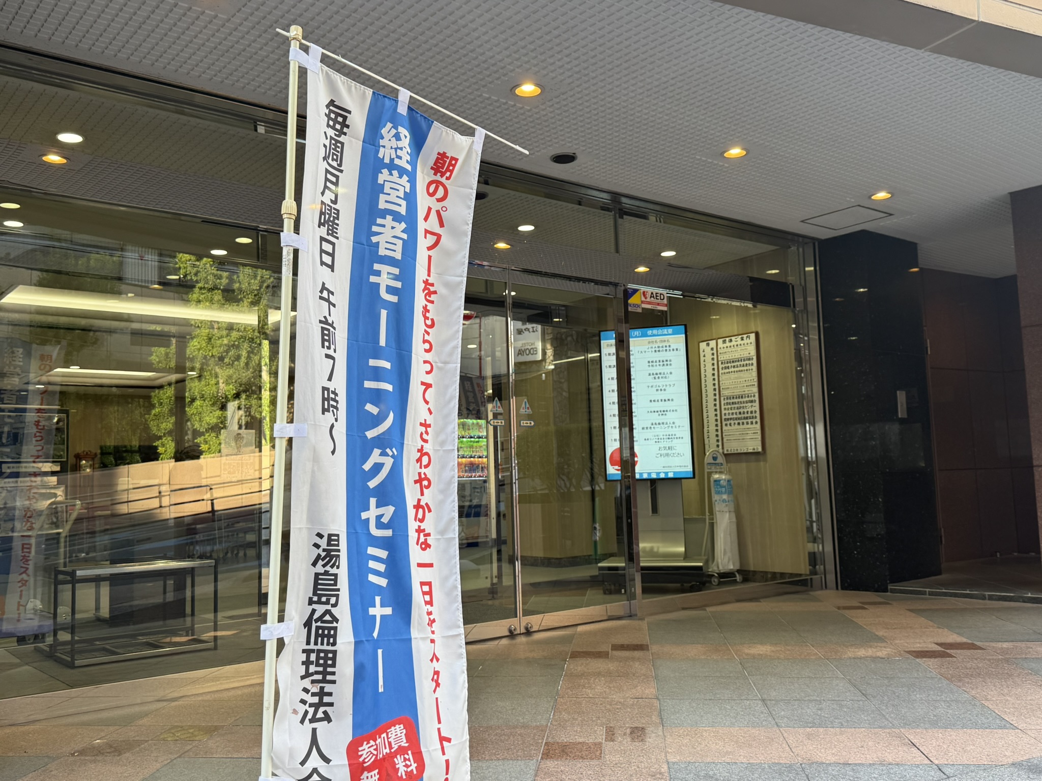 湯島倫理法人会のモーニングセミナーは、毎週月曜日の朝7時から8時まで開催されています。参加費は無料で、会員・非会員を問わずどなたでも参加できます。